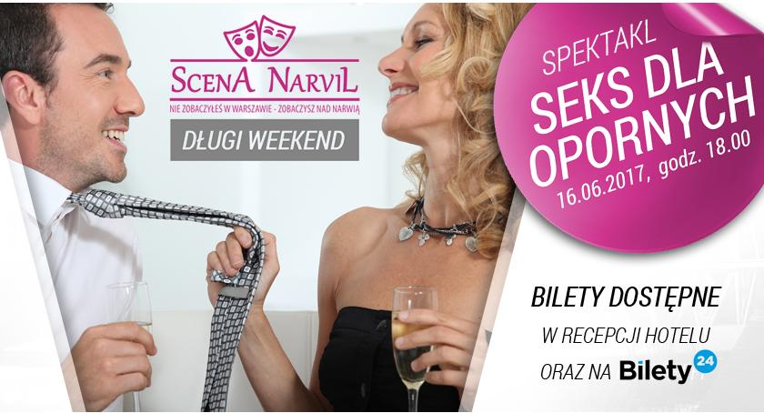 W piątek, 16 czerwca o godz. 18:00 hotel Narvil w Serocku zaprasza na spektakl „Seks dla opornych”. Przedstawienie jest prezentowane w ramach projektu Scena Narvil w nowoczesnych hotelowych wnętrzach. Scena swoją działalność rozpoczęła w ubiegłym sezonie.