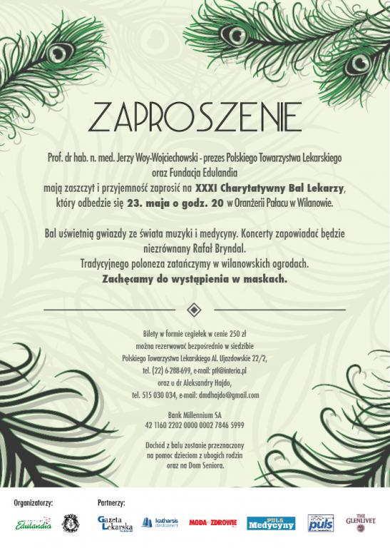 23 maja o godz. 20:00 w Oranżerii Pałacu w Wilanowie odbędzie się XXXI Charytatywny Bal Lekarzy. Poza osobistościami środowiska lekarskiego bal uświetnią również znani artyści i gwiazdy, a całe wydarzenie poprowadzi Rafał Bryndal.